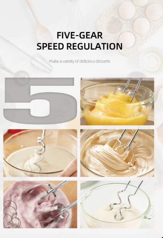 The Haley HY-1660 hand mixer is the ideal appliance for quickly and easily preparing creams, foams and doughs. With a 500W motor and 5 speed settings, it gives you total control over the desired consistency, whether it's light mixing or thicker mixtures.